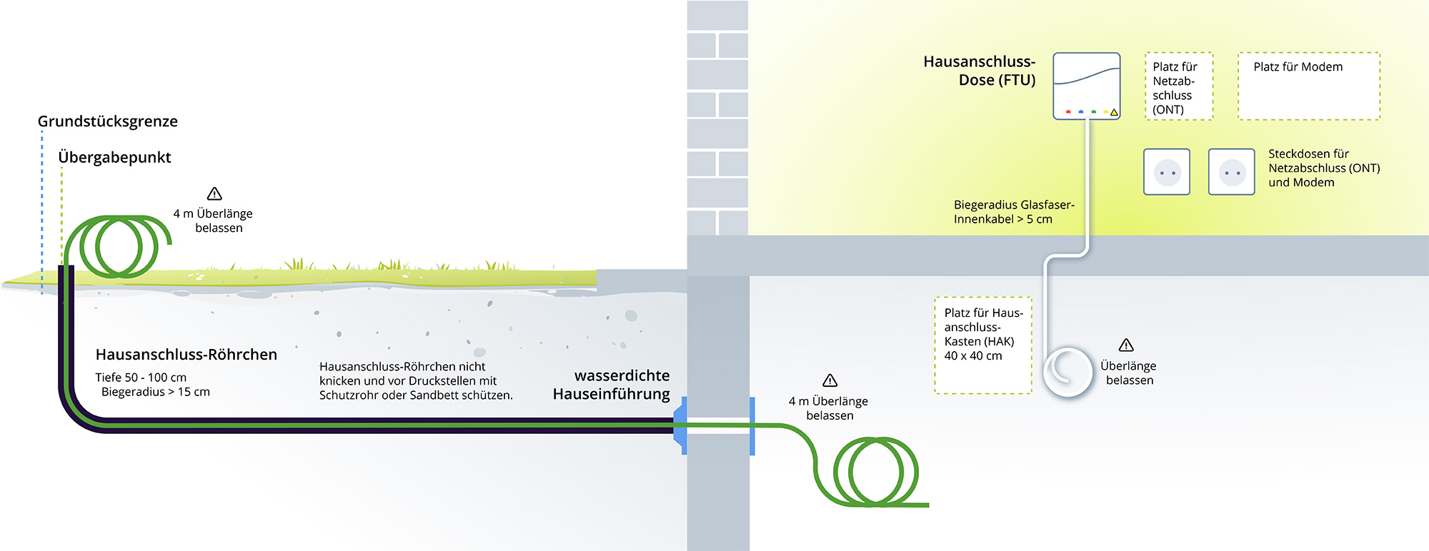 Wichtig: Für eine reibungslose Herstellung müssen alle Arbeiten im Außenbereich und in Ihrem Haus rechtzeitig erledigt sein. Das Kabelbau-Unternehmen setzt sich direkt mit Ihnen in Verbindung.