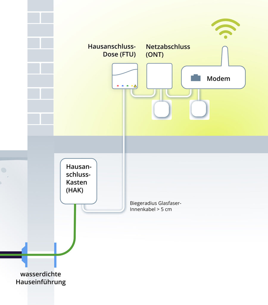 Grundsätzlich sind Sie dabei völlig frei, solange der Raum trocken und geschützt ist. Für eine gute W-Lan Verbindung empfiehlt sich ein zentraler Standort im Haus oder im Büro. Für den Betrieb von Modem und Anschluss sollten zwei 230V Schuko-Steckdosen vorhanden sein. Am Aufstellungsort sollte ausreichend Platz für die optische Hausanschluss-Dose (FTU) für den Aktiven Netzabschluss (ONT) sowie für das Modem vorhanden sein.